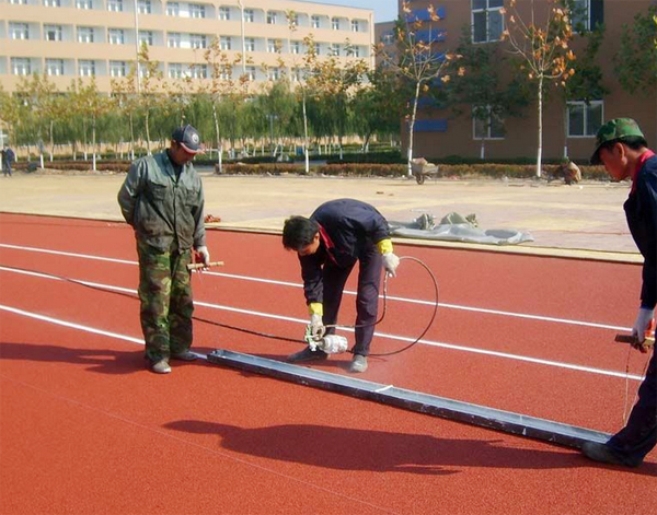塑胶跑道施工是将甲组分、乙组分混合搅拌—加入催化剂—搅拌成粘稠胶料——加入圆桶搅拌机与黑胶粒搅拌均匀—用运料车运送到现场—摊铺机铺设底胶—喷涂表面防滑颗粒—常温固化—测量、画线