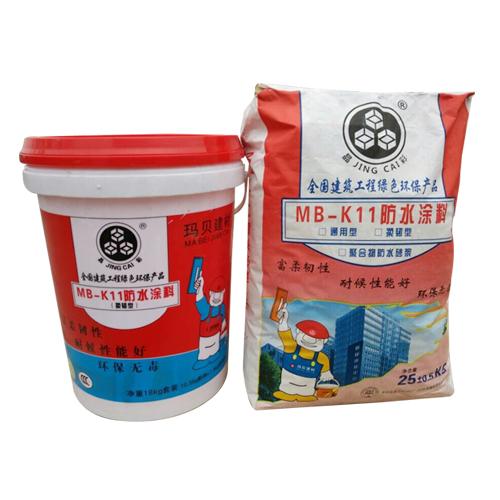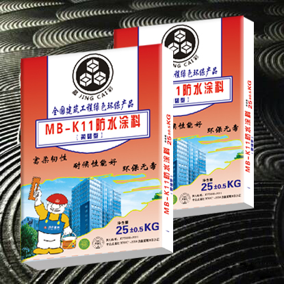MB-K11柔韧型防水砂浆是一种双组分、丙烯酸类高聚物改性的水泥基防水材料,由水泥、级配骨料和精选助剂的粉料及液态高聚物添加剂等组成。粉料与添加剂混合后,发生化学反应,形成一层永久性的坚韧的弹性防水膜,该膜对混凝土和灰浆有良好的粘附性,能与之形成紧密牢固的永久性结合,阻止了水的渗透。