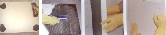 ●条粘法:把胶浆均匀地批在保温板背面上,然后用齿形刮板拉成齿状,即把保温板贴上墙面,轻揉压平。 |