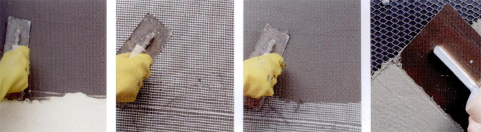 ● 再用刮刀将玻纤网或钢网压入湿胶浆中并抹平。 | |