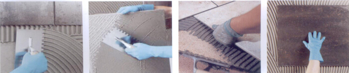 ● 用齿型抹灰好将胶浆均匀地涂抹工作面上,每次约涂抹1㎡左右,然后将瓷砖抒压于上面。 | |